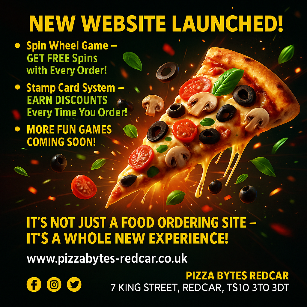 Pizza Bytes Redcar is a reliable first class party food supplier throughout the Teesside, Middlesbrough, Redcar, South Bank, Grange Town, Saltburn, Marske-by-the-Sea, New Marske, Kirkleatham and Guisborough  areas.